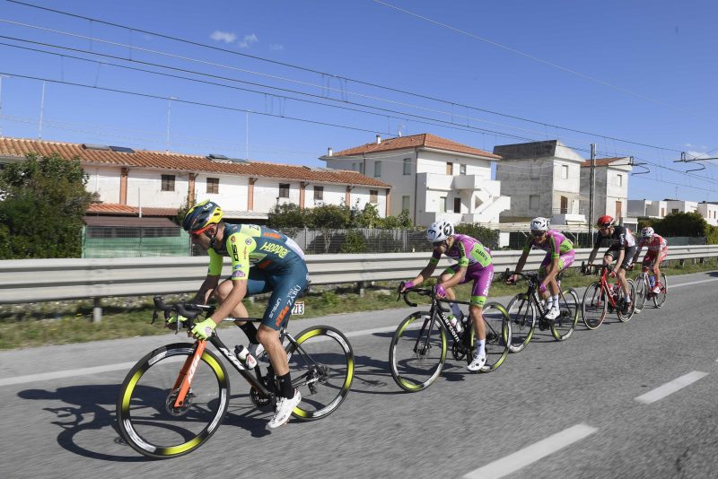 Bais looked the most active of the escapees, the 23-year-old skipping clear on the only categorised climb of the day, Monte San Bartolo, to get some TV time for his sponsor and take the KOM prize over the summit.