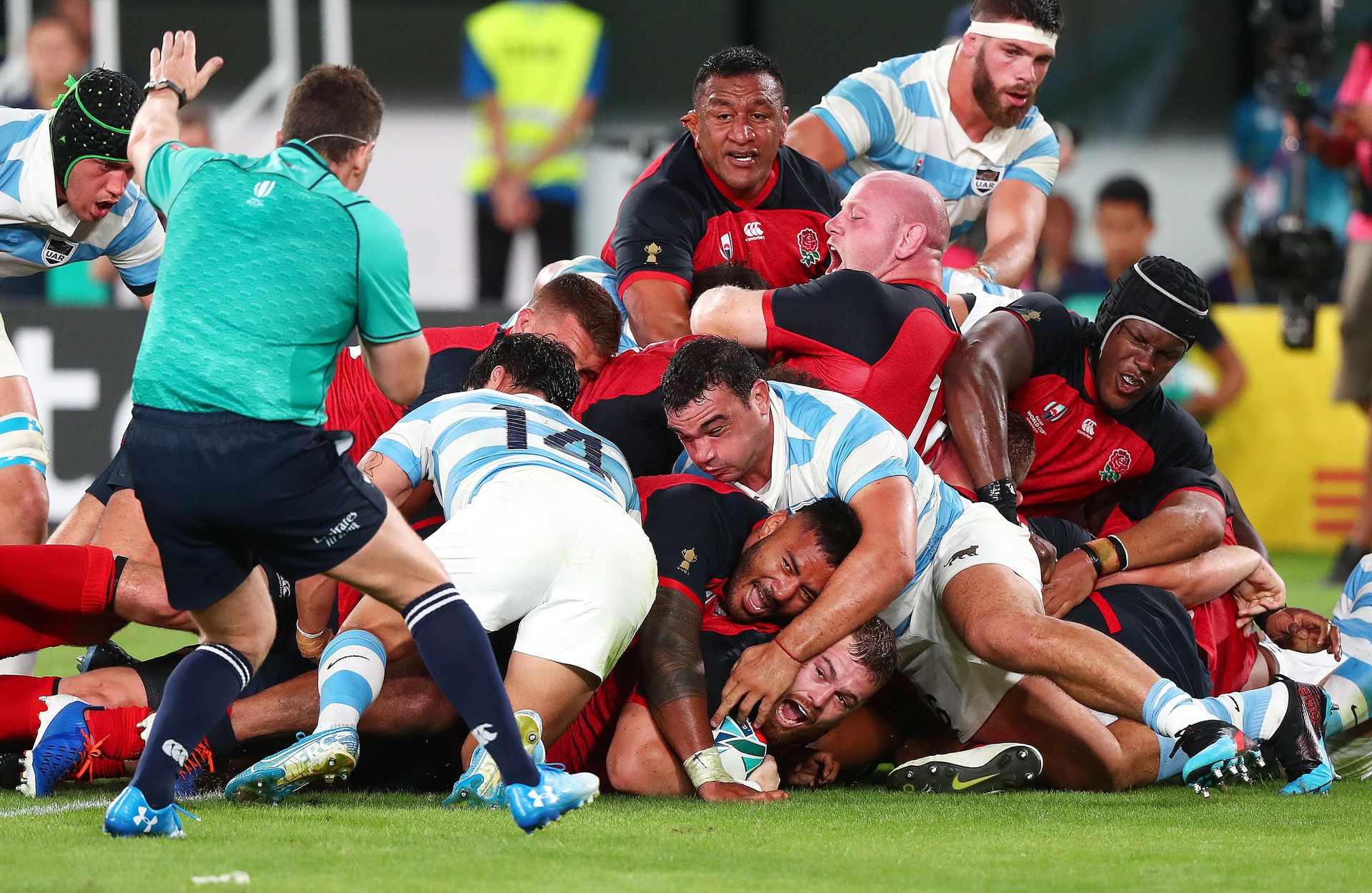 The Pumas’ discipline was causing referee Nigel Owens concern and he warned captain Pablo Matero for a late hit on Ben Youngs, who, making his 92nd appearance, became the third most capped player for his country.