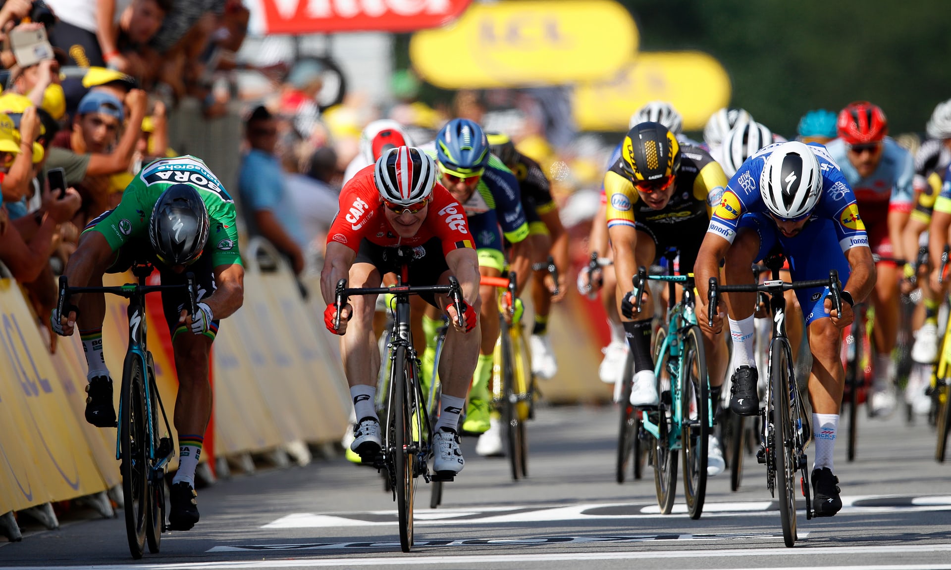 Dutchman Dylan Groenewegen (LottoNL-Jumbo) and Germany’s Marcel Kittel (Katusha-Alpecin) completed the top five as Belgium’s Greg van Avermaet (BMC) retained the yellow jersey on a largely uneventful day in north-west France.
