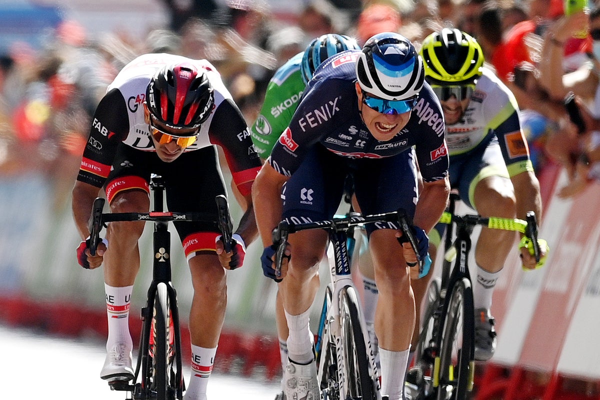 Astana and Omar Fraile tried to lead out Alex Aranburu, trailing Roglič by six seconds on GC and with bonus seconds up for grabs, but he was beaten by Deceuninck – Quick-Step’s Fabio Jakobsen, the Spaniard having to settle for just the two seconds across the line.