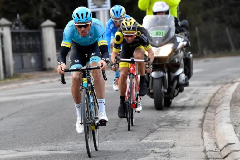 The slopes of the climb saw Astana set a fierce tempo to drop stage two winner Dylan Groenewegen (LottoNL-Jumbo) and Nacer Bouhanni (Cofidis), but Arnaud Démare looked comfortable as he sat towards the front of the bunch. However things were not quite so comfortable for Team Sky co-leader Wout Poels, who punctured midway up the climb before starting a frantic chase.The first attack came from Julian Alaphilippe (Quick-Step Floors) who moved clear with Tim Wellens (Lotto-Soudal), forcing BMC Racing and Mitchelton-Scott to take up the chase behind as Démare was dropped.