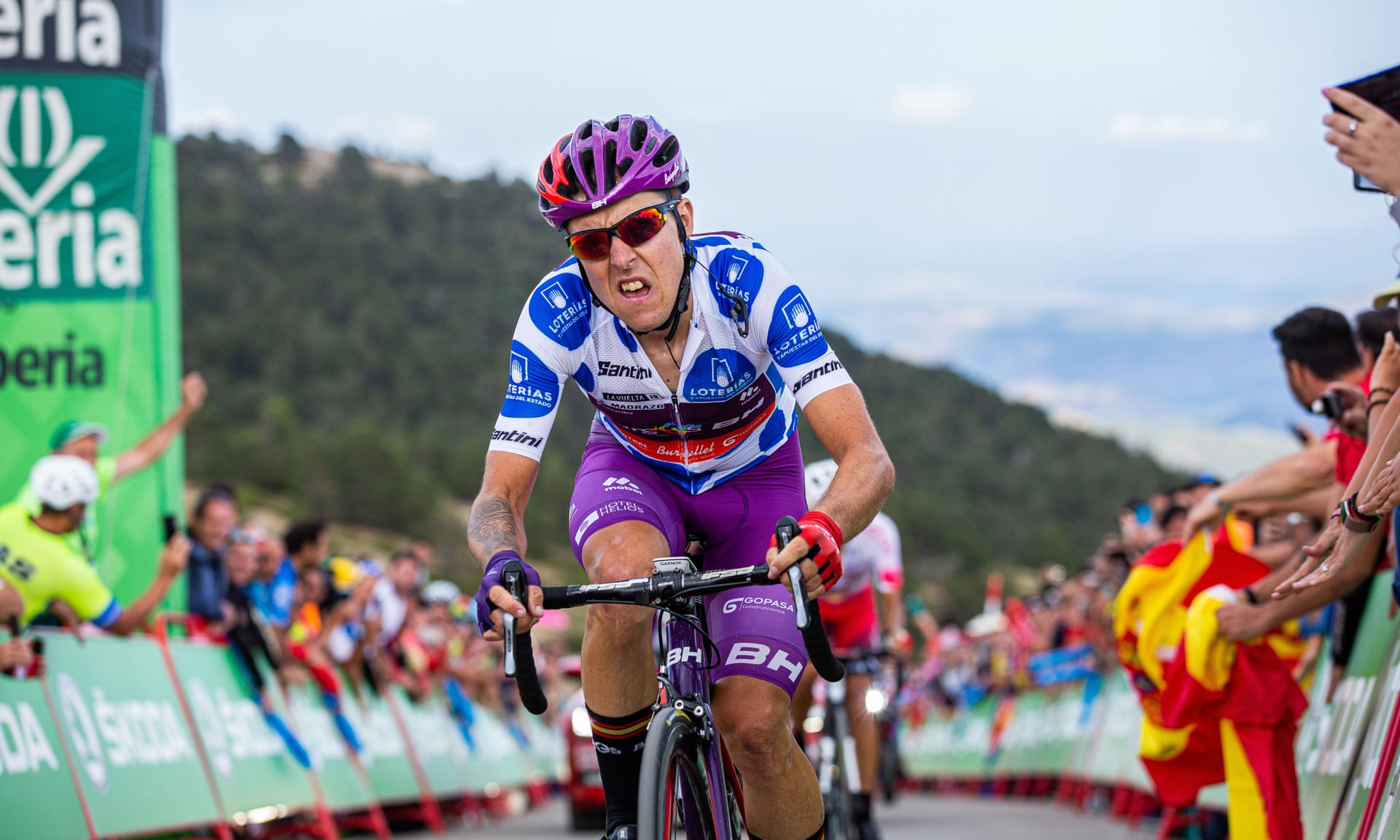 Madrazo, the polka dot jersey, was dropped on numerous occasions on the 11km final ascent – and was almost knocked off his bike by his team car – but fought back in the final kilometre to take an historic win ahead of Burgos-BH teammate Jetse Bol and Jose Herrada of Cofidis.