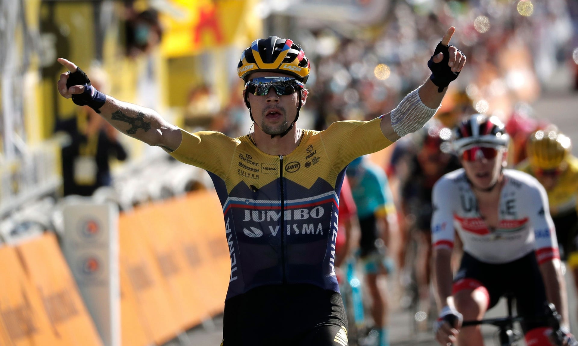 Roglic and Alaphilippe had the best positions coming onto the home straight from the final bend, with Lopez boxed out by the barriers and losing momentum. And with the Frenchman tiring, only Pogacar, the 23-year-old Slovenian riding his maiden Tour, had the pace to keep vaguely in touch with his compatriot.