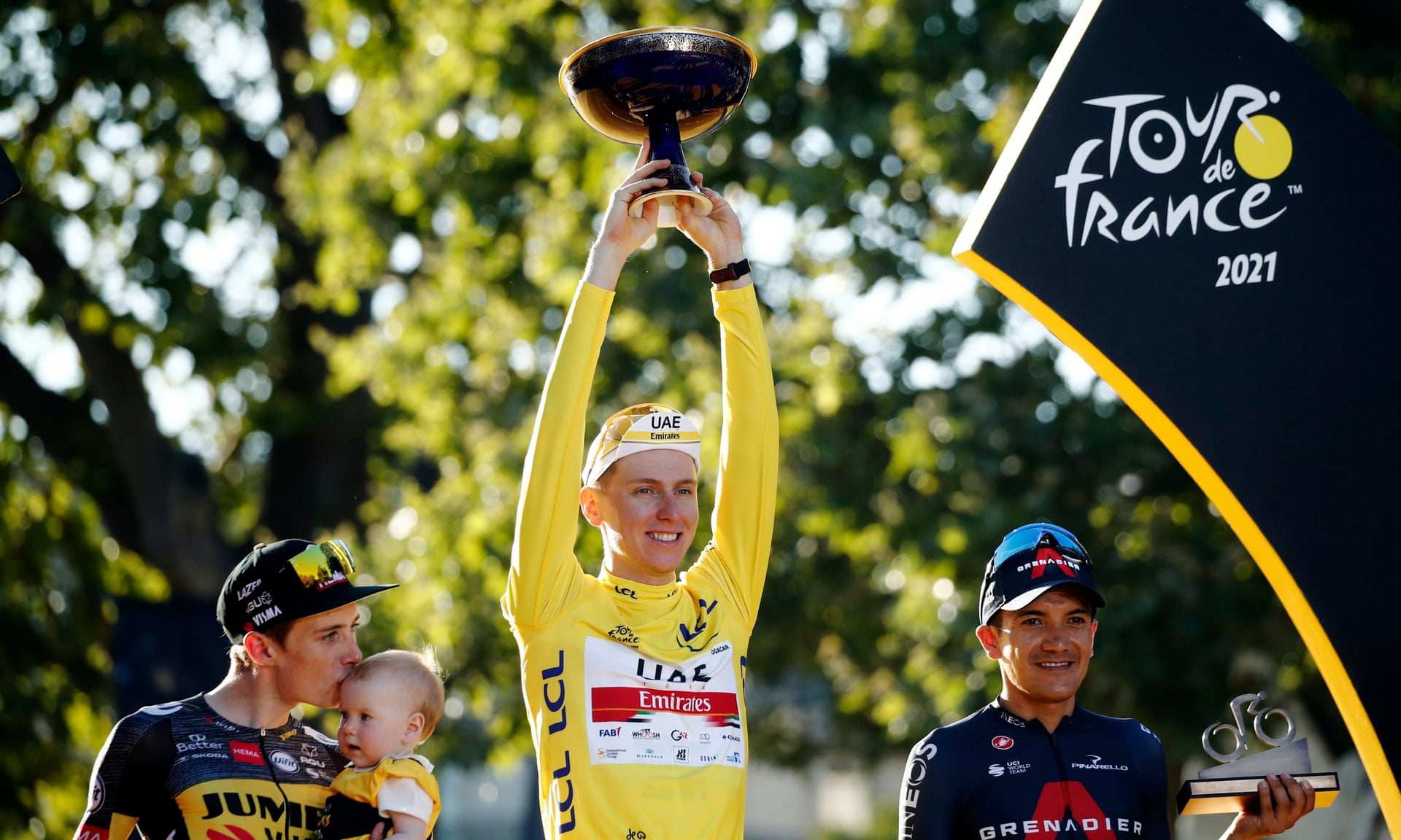 Tadej Pogačar enjoyed the processional final stage that confirmed his yellow jersey, his second win in as many appearances for the 22-year-old Slovenian, Jonas Vingegaard second, five minutes down, and Ineos’ Richard Carapaz taking the third spot on the final GC podium.